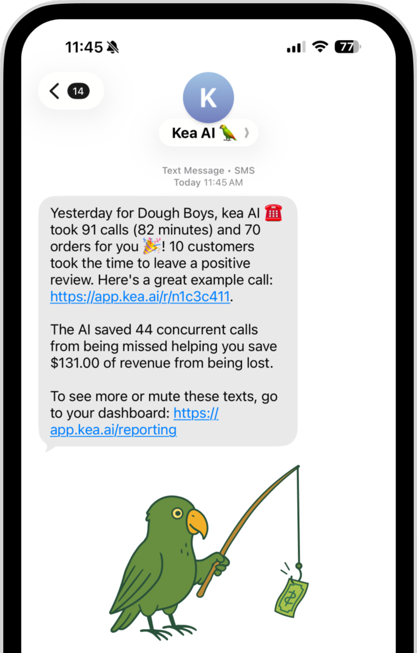 Dinner rush brings unlimited calls but your employees have a limit. Meet Kea, your friendly Restaurant Voice AI that answers every call, takes every order, and never burns out.